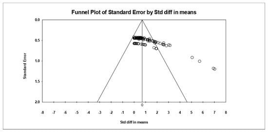 In the present study, the Q-value was 342.423 (Table 1), which is larger than the df of 126, suggesting that the population effect sizes are different. The probability of significance (p-value) of the homogeneity test was <0.10; therefore, the heterogeneity of the effect sizes was significant. This suggests that the random-effects model was appropriate. I-squared represents a ratio of actual variance to total variance: 25%, 50% and 75% indicate a small, moderate and very large level of heterogeneity, respectively. In this study, I-squared was 63.311, suggesting heterogeneity among the populations.