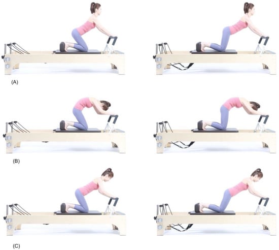 Subjects performed knee stretch using a Pilates reformer (V2 Max™ Reformer, Toronto, ON, Canada) as the Pilates-based stabilization exercise. The subjects were instructed to perform knee stretches on a reformer. The tension for springs used were set between 2.4 and 3.3 kg (75% Reformer spring, Merrithew™, Toronto, ON, Canada). The subjects kneeled on a movable carriage with their feet placed against the shoulder rests. Both hands held onto the footbar, and the subjects were instructed to lift their hips moving away from the legs. Knee stretches were performed using three different methods with different starting positions (Figure 1). In the first method, the subjects performed the exercises while maintaining a flat back with a neutral pelvis (FNP). At this point, they were instructed to look 45° downward and maintain their trunk and hip positions. For the second method, they maintained a round back with a posteriorly tilted pelvis (RPP) while performing the movements. Each subject tilted their pelvis posteriorly and flexed their spine to create a round back posture before performing the tasks. They spontaneously looked down toward their knees. In the final method, the subjects were instructed to maintain an extended back with an anteriorly tilted pelvis (EAP) during the knee stretch movements. The subjects looked towards the front and maintained an extended posture throughout the task. For all three methods, the starting position was in the ‘home’ position, which was the point where the carriage was closest to the footbar. The subjects were instructed to move the carriage away from the footbar as far as possible while maintaining the starting position. At the endpoint of the stretch, the subjects maintained their position for one second before bringing the carriage to the home position. Before the measurement, all procedures and cautions were explained to each participant. The subjects practiced the movements three times before the trials. A total of 40 s were required to perform five repetitions, with each repetition comprising 8 s:3 s for the moving part and 1 s for the holding part, with five repetitions performed for each condition.