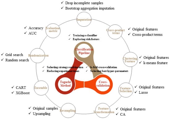 In this study, the basic components are summarized in Figure 1, consisting of four main parts: classification pipeline, CV, Taguchi method, and improved strategies. The association of classification pipeline and CV is described in Section 2.1, and nine strategies of model performance improvement are separately discussed in Section 2.2. Finally, integration of all components using the Taguchi method is introduced in Section 2.3.