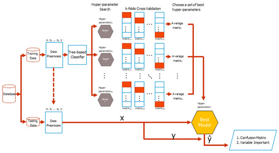 The basic flowchart of the CV classification task is shown in Figure 2. The original dataset comes from different sources, such as basic information, basic examination data, blood test, and daily medication preference of patients, which are finally wrangled in a tidy form where columns mean different features, as well as the class labels, while rows mean cases. Then the original dataset is divided into training and testing datasets with a specific separation rate, typically 6:4, 7:3, or 8:2. During the training period, the training dataset is preprocessed resulting in either increasing or decreasing the number of columns or extracting embedding or group features. Search for hyper-parameters of a classifier during the training process is the next concern. The different base classifier has a different number of hyper-parameters, thus manual selection of a good hyper-parameter combination is very difficult. The process of combing the skills of deciding a hyper-parameter search strategy, conducting the k-fold CV, and selecting an evaluation metric is the most commonly used method to tackle the problem in the practice.