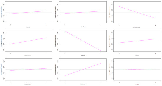 The regression equation of the fitted model is described in Equation (2). A positive or negative effect on the task of maximizing the training balanced accuracy as a coefficient of factor is also positive or negative, respectively. The R squared score is at a good level of 84.16%, which means that we are above 84% from the proportion of variance explained by the fitted regression model.
