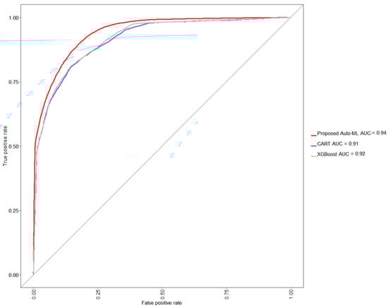 Based on the optimal model selected throughout the training process described above, approximately 20,068 cases were further fed for testing the model’s performance of the proposed method. The rate of third-stage CKD progression in testing data is also approximately 34.69%. In Table 2, the proposed auto-ML scheme auto-selects the level of each strategy to associate with a classifier, which finally shows an acceptable testing accuracy of 86.17%, balanced accuracy of 84.08%, a sensitivity of 90.90%, and specificity of 77.26%, precision of 88.27%, and F1 score of 89.57%. Further, comparing the performance of two naive situations, i.e., only CART or XGBoost classifier is used and none strategy is adopted, the CART yields a lower testing accuracy of 84.14%, balanced accuracy of 82.02%, sensitivity of 88.97%, and specificity of 75.06%, precision of 87.04%, and F1 score of 87.99%, whereas the XGBoost also yields a lower testing accuracy of 83.82%, balanced accuracy of 79.39%, sensitivity of 93.86%, and specificity of 64.92%, precision of 83.44%, and F1 score of 88.34%. From this model comparison experiment, it can be seen that the classification accu-racy of CART has reached the level of about 84%. Compared with CART, the classification accuracy of XGBoost has decreased, and the level of specificity has also been sacrificed. In this study, XGBoost was selected as the basic classifier, and with the help of other strate-gies, it can further improve the classification accuracy rate by about 2% and the predic-tions will not be biased towards the majority class. A graphical comparison via a receiver operating characteristic (ROC) curve is also shown in Figure 5, confirming that the proposed method provides an easy way to auto-find out a suitable model for a given dataset.