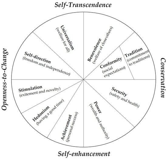 Human Values Framework, reprinted from Schwartz [] with permission from Elsevier. The circumplex structure shows the compatibilities between adjacent values (e.g., universalism and benevolence) and oppositions between conflicting values (e.g., universalism and power). The labels outside the circumplex refer to combinations of values that are seen as higher order values (e.g., openness to change and conservation).