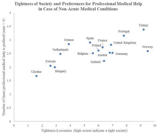 The presence or absence of pressure to do things in a specific way could influence the dependence on professional medical help; when the social norm is to seek professional help, it may lead to a higher preference for professional help in tight societies. Moreover, as societal tightness is considered a societal adaptation to survival in harsh circumstances [], it may also be associated with a stronger focus on avoiding risk (in general) in that nation. In the latter context, visiting a healthcare specialist can be considered a risk reducing strategy. Thus, we expect that preference for choosing professional medical help will be higher in tight societies.