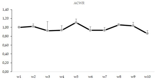 ACWR over the 10 week period is presented in Figure 3. Overall, ACWR presented the highest value in week 5 (1.11 AU) and the lowest in week 10 (0.86 AU).
