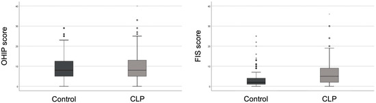 Regarding the global questions, the mean score for quality of life according to the OHIP was 9.4 ± 6.2 and 10.2 ± 7.2 for the control and CLP group, respectively. The parent-reported overall FIS score was 4.0 ± 5.4 for the control group and 6.7 ± 6.3 for the cleft group. No significant difference was found between groups in OHIP-14 score. Conversely, FIS score revealed a significant difference between the two groups evaluated (p < 0.001) (Table 3). The distribution of values in OHIP and FIS scores is shown in Figure 1. Regarding the type of cleft (unilateral vs bilateral) the global scores do not have statistically significant differences (OHIP-14: p = 0.382; FIS; p = 0.873).