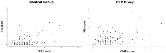 There was a weak positive correlation between a patient’s quality of life (OHIP) and a parent’s quality of life (FIS) assessment. Additionally, it was also verified that control group (rSpearmann = 0.267, p = 0.004) had a lower correlation than the CLP group (rSpearmann = 0.328, p < 0.001). Figure 2 shows dispersion graphs of both groups.