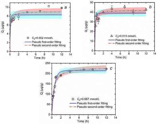 Kinetic adsorption of MTAsV on the natural sediment and their fitting curves using pseudo-first-order and pseudo-second-order models, in which the initial concentrations of MTAsV (C0) are 0.002 (a), 0.013 (b), and 0.667 (c) mmol/L, respectively. The shadow represents the confidence band under the 95% confidence level for fitting curves.