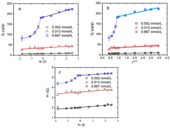 The adsorption kinetics of 0.002, 0.013, and 0.667 mmol/L MTAsV on the natural sediment are shown in Figure 2. Overall, the adsorption capacity of MTAsV (Qt) increases rapidly in a short time and then increases slowly before 8 h, and finally approaches an asymptote. This is consistent with the previous studies about the sorption of arsenite, arsenate, and thioarsenic on minerals and soils [,,,]. Specifically, when the concentration of MTAsV is as low as 0.002 mmol/L (which is equivalent to 0.15 mg As/L) (Figure 2a), Qt increases rapidly to 7.09 μg/g within 10 min. After that, it increases slowly to 9.64 μg/g before 8 h and finally tends to be stable after that. For the mid-concentration of 0.013 mmol/L MTAsV (which is equivalent to 1.00 mg As/L) (Figure 2b), it is found that Qt increases rapidly to 37.54 μg/g within 30 min, then increases slowly to 42.90 μg/g at 8 h, and finally tends to be stable after that. For the high concentration of 0.667 mmol/L MTAsV (which is equivalent to 50.00 mg As/L) (Figure 2c), Qt increases rapidly to 181.00 μg/g within 50 min, then increases slowly to 219.50 μg/g before 8 h, and finally keeps stable after that. In the initial stage, Qt increases rapidly because there are enough reactive sites on the surface of the sediment to adsorb a large number of MTAsV []. This stage becomes longer with the increasing concentration of MTAsV, which may be because it needs more time for the higher concentration of MTAsV to be adsorbed by the solid phase. After that, MTAsV adsorption becomes slower, and the adsorption rate decreases, which may be because internal diffusion becomes the dominant process in this stage, and the internal diffusion resistance increases with more MTAsV adsorbed by the solid phase []. From 8 h to 12 h, all the adsorption of different concentrations of MTAsV reaches equilibrium when the internal diffusion resistance is very high and the mass concentration driving force is too low to force MTAsV to be adsorbed by the solid phase. Therefore, considering the stability of MTAsV, 8 h is determined to be the adsorption equilibrium time for different concentrations of MTAsV adsorbed by natural sediments.