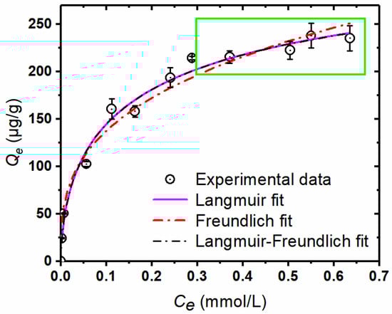 Adsorption isotherms of MTAsV on 0.50 g/50 mL sediments at pH 7 and 25 °C. The data in the green rectangle represent a stable trend of MTAsV sorption (Qe) at higher As equilibrium concentrations (Ce).