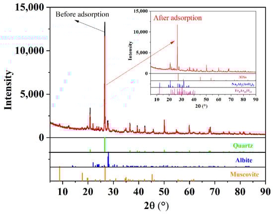 Mineral composition results of sediment before and after MTAsV adsorption using XRD analysis (Figure 5) show that the major mineral composition is quartz (SiO2) according to the standard card of PDF#46-1045, and the minor mineral compositions are mainly albite (ordered, (Na, Ca)Al(Si, Al)3O8) and muscovite ((K, Na)(Al, Mg, Fe)2(Si3.1Al0.9)O10 (OH)2) according to the standard cards of PDF#41-1480 and PDF#07-0042, respectively. After MTAsV adsorption, it is found that all the peak intensities of sediment decrease slightly, indicating that the crystallinity of sediment is weakened. This may be attributed to the complexation of the adsorbed As and Fe-(or Al-) compounds of the sediments, because after MTAsV adsorption, there are almost no changes for the major and minor mineral compositions, while some As-Al and As-Fe compounds are detected on the sediments. Using the As-bearing mineral phase peak match, the adsorbed As compounds on the sediment are probably AlAs, Na3Al2(AsO4)3, and Fe8As10O23 according to the standard cards of PDF#17-0915, PDF#51-0346, and PDF#35-0462, respectively. This means that MTAsV adsorption on the sediment is mainly attributed to its complexation with Al- and Fe-bearing compounds.
