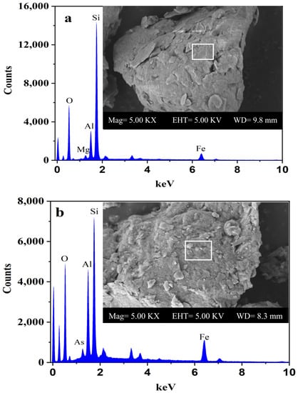 The surface morphology of sediment before and after MTAsV adsorption is determined using the Scanning Electron Microscope (SEM), and the results are shown in Figure 6. Meanwhile, elemental analysis of sediment is determined using the Energy Dispersion Spectrum (EDS) and the results are listed in Table 5. Before adsorption, the surface structure of the sample is smooth, while some small crumps and crystals occur on the surface after adsorption. EDS results show that before MTAsV adsorption, the major elements of sediment and their average percentages are in the order of O (39.80%), Si (28.68%), Fe (13.69%), and Al (12.28%). After adsorption, on the sites where no crumps and crystals are found on the surface of the sediment, none of As is detected and the major elements and their average percentage are in the order of O (46.85%), Si (24.58%), Fe (8.44%), Mg (7.34%), and Al (6.99%). However, on the sites with some crumps and crystals, As is detected at the range of 0.14–0.46% and the major elements and their average percentages are in the order of O (32.05%), Si (31.62%), Fe (19.09%), and Al (14.28%). This means that MTAsV adsorption mainly occurs on the surface sites with higher contents of Fe and Al. In addition, none of S is detected on the surface of sediments after MTAsV adsorption, indicating that the adsorbed MTAsV probably transforms into other As species, which are probably AlAs, Al-As-O, and Fe-As-O compounds according to the former XRD analysis results (Section 3.4.1).