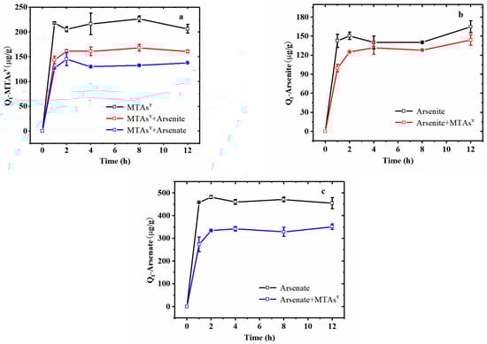 Figure 7 shows the changes of MTAsV, arsenite, and arsenate sorption capacities (Qt) with time in natural sediments and groundwater systems containing single As ion and binary As species, respectively. It can be seen that MTAsV, arsenite, and arsenate adsorption kinetics show similar trends both in single As ion and binary As ions systems. In which, arsenate shows the highest equilibrium sorption capacity (Qe) to natural sediments, which is about twice as large as that of MTAsV. Previous studies have found that amorphous Al(OH)3 and α-FeOOH can also adsorb much more arsenate compared to MTAsV [,,]. This phenomenon may be attributed to the fact that the SH group of MTAsV has a larger volume than the OH group of arsenate, inhibiting the surface complexation of MTAsV with sediments [,]. Arsenite shows a slightly lower sorption capacity than MTAsV and a much lower sorption capacity than arsenate to natural sediments. This is probably because the major compositions of natural sediments including Fe- and Al-bearing minerals are responsible for As adsorption from aqueous solutions. It has been reported that both Al2O3 and Fe2O3 show higher adsorption capacities for arsenate compared to arsenite [,]. On one hand, amorphous Al oxide has a higher site saturation for arsenate (3.8 × 10−2 μmol/m2) than arsenite (2.3 × 10−2 μmol/m2) []. On the other hand, at a pH of 7, the positively charged Fe2O3 has a stronger electrostatic attraction to the negatively charged arsenate than the electrically neutral arsenite, therefore, it can adsorb more arsenate (Qe = 4122 ± 62.79 μg/g) than arsenite (Qe = 2899 ± 71.09 μg/g) [].