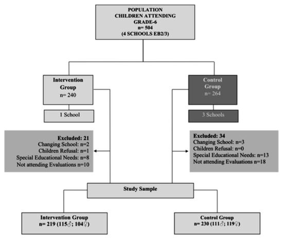 A total of 504 children were registered in grade 6: 47.6% of children attended one school and was selected for the intervention group (IG), while the other three schools served as the control group (CG). No chance of contamination between groups was possible. Random assignment of children among different classes and schools to be the CG or IG was impossible due to practical reasons of working, and it would generate bias in outcome results. Indeed, synergies should be created over daily contacts between subjects of IG for a successful implementation of the programme in a school environment [21].