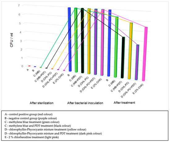 In our study, we did not obtain a statistically significant difference (at p = 0.05) in the reduction of the number of bacterial colonies between the study groups and group 5 (where only CHX was applied). These results are in contradiction to those obtained by Arash Azizi et al. [24], who achieved a statistically significant bacterial decrease when they used combined therapy—PDT associated with CUR or PDT associated with MB—in comparison to the control group (CHX).