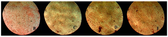 After counting the bacterial colonies, the samples were examined using an optical microscope (OPTIKA, B-600Tiph, Italy, 100×/1.25× oil PH, PLAN) in order to characterize the bacterial colonies. The bacterial colonies were evaluated in two stages: the first after bacterial inoculation for groups B, C, D, and E (Figure 4) and the second after applying all the interventions: MB, MB + PDT, CHL–PC, CHL–PC + PDT, and 2% CHX (Figure 5).