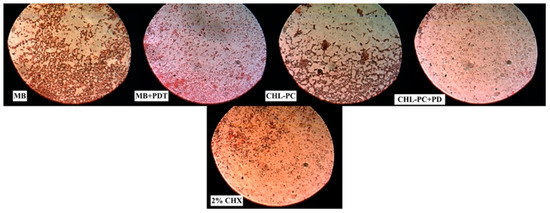 Characterization of bacterial colonies after MB, MB + PDT, CHL–PC, CHL–PC + PDT, and 2% CHX experimental treatments using an optical microscope (OPTIKA, B-600Tiph, Italy, 100×/1.25× oil PH, PLAN).