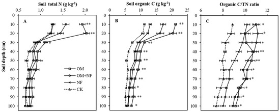 Effect of five years of continuous N equivalent fertilizer substitution treatments on the depth distribution of soil total N (A), soil organic C (B), and organic C/TN ratio (C) in the profile. ** Significant differences among treatments at p < 0.01, * significant differences among treatments at p < 0.05. OM, organic manure; OM + NF, organic manure with nitrogen fertilizer; NF, nitrogen fertilizer; CK, control.