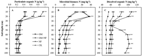 Effect of five years of continuous N equivalent fertilizer substitution treatments on the depth distribution of particulate organic N (A), microbial biomass N (B), and dissolved organic N (C) in the profile. ** Significant differences among treatments at p < 0.01, * significant differences among treatments at p < 0.05. OM, organic manure; OM + NF, organic manure with nitrogen fertilizer; NF, nitrogen fertilizer; CK, control.