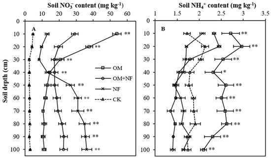 Effect of five years of continuous N equivalent fertilizer substitution treatments on the depth distribution of NO3− (A) and NH4+ (B) in the soil profile. ** Significant differences among treatments at p < 0.01, * significant differences among treatments at p < 0.05. OM, organic manure; OM + NF, organic manure with nitrogen fertilizer; NF, nitrogen fertilizer; CK, control.