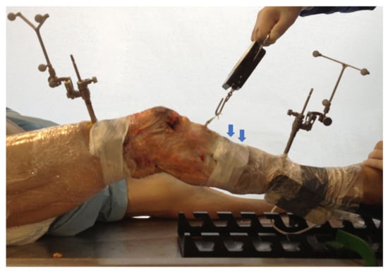 Setting of a cadaveric investigation using non-invasive inertial sensor (blue arrows).