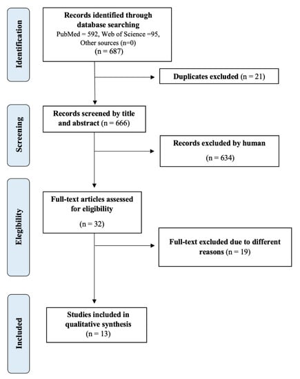 After identification of 687 documents (PubMed = 592) and WOS (n = 95) and elimination of 21 duplicates, 666 documents were selected. Of this number of articles, 634 were finally excluded by reading the title and abstract, 18 for not being adaptations and validations of questionnaires or studying mixed or male population. Finally, we were left with a total of 13 articles to carry out our systematic review, reflecting this entire selection process in the flow diagram below (Figure 1).