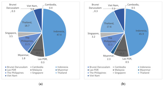 Shares of the E-waste generation amounts in ASEAN: (a) the shares in 2015; (b) the shares in 2019.