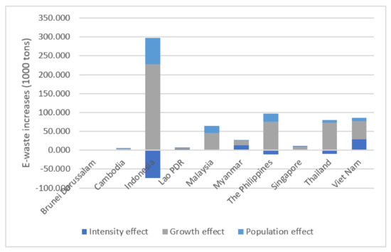 Analysis results show that E-waste generation increased significantly in ASEAN countries due to economic growth and the E-waste intensity effect rather than the population effect. In particular, from 2015 to 2019, Cambodia, Indonesia, Malaysia, the Philippines, Singapore, Thailand, and Viet Nam had the most significant economic growth effect among the three factors; Brunei Darussalam, Lao PDR, and Myanmar had the most enormous E-waste intensity effect. When comparing ASEAN countries, in terms of quantity, Indonesia had the most significant increase of E-waste due to the economic growth effect and population effect, while Viet Nam had the largest increase of E-waste due to the intensity effect. However, when comparing ASEAN countries based on the growth rate through multiplicative decomposition, Viet Nam had the largest economic growth effect, and Lao PDR had the most considerable intensity and population effect.