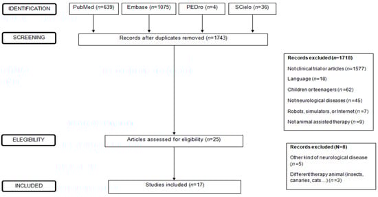 Exclusion criteria were: letters to the editor, single case studies, communications to conferences, revision, or systematic review; not written in English or Spanish; performed on children or teenagers (in diseases such as cerebral palsy, autism…); no accurate diagnosis of neurological disease (for example, those aimed at the elderly, who did not have a diagnosis in dementia or those who were disorders of the psychiatric area, such as post-traumatic disorders); made in robots; other neurological diseases that were not addressed in the systematic review (acquired brain injury or minimally unconscious state); animal-assisted therapy not performed with horses or dogs solely (for example with canaries or insects).