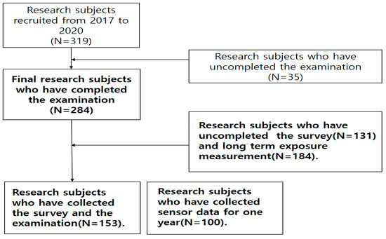 Thirty-five participants were excluded from the study, including 23 who had missing data and 12 who did not participate in the study for ≥15 days after PM was measured. Only those housewives who reported residing indoors for a long period of time every day were selected for this study. Therefore, 284 participants were finally enrolled in the study. The average age was 34 years. All participants were married housewives living indoors with childcare responsibilities. The average number of children was 1.59, with an average 3.28 years of childcare after giving birth. We recorded the BMI, smoking frequency, and alcohol consumption for all participants once as part of the short-term study. These lifestyle habits were measured twice a year for participants who took part in the long-term study (n = 100) (Figure 2). Smoking and frequent alcohol consumption were reported in 10% of participants. Blood samples were collected 2–3 days before PM measurements were conducted using gravimetric analysis and sensors.