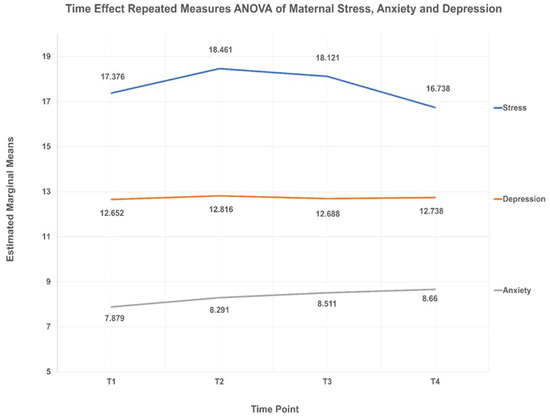 Time effect repeated measures ANOVA of maternal stress, anxiety, and depression. Note: (1) A stress score between 14 and 26 indicates moderate stress, (2) An anxiety score between 0 and 7 and between 8 and 10 indicate low and moderate levels of anxiety, respectively, (3) A depression score between 11 and 21 indicate high levels of depression.