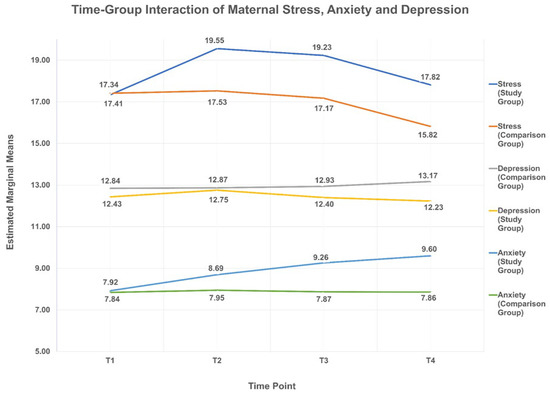 Time–group interaction of maternal stress, anxiety, and depression. Note: (1) A stress score between 14 and 26 indicates moderate stress, (2) An anxiety score between 0 and 7 and between 8 and 10 indicate low and moderate levels of anxiety, respectively, (3) A depression score between 11 and 21 indicate high levels of depression.