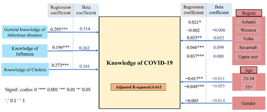 Firstly, our study suggests that public knowledge of COVID-19 in Ghana is generally good, as the overwhelming majority of the 1560 respondents questioned, in cities and also in the countryside scored an average of 69.9%. These results are indeed comparable to studies from neighboring countries such as Côte d’Ivoire, Burkina Faso, Nigeria, Uganda, and Gambia [18,19,20]. These findings may be explained with prior exposure and experiences of the population to and with similar infectious outbreaks, for instance, cholera, which accounts for 3.8% of fatalities in Ghana each year [21]. Indeed, knowledge of COVID-19 at 69.9% was associated positively with knowledge of other existing infectious diseases—cholera and influenza, with a 64.3% level of explained variance among the population. Knowledge related to these two infectious diseases, along with the socio-demographics surveyed accounted to more than 70% of the difference among the knowledge of the population about COVID-19, Figure 3 and Figure 4.