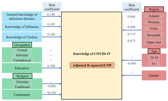 The model was extended stepwise to assess for the influence of other socio-demographic characteristics of the sample. The type of community, whether rural or urban, affected the variance in the knowledge of COVID-19 variable only slightly, and the explained variance rose insignificantly from 64.4% to 65.4%. As anticipated, education and occupation also increased the explained difference in knowledge of COVID-19 from 65.4% to 70.3%, which is significant at p = 0.001, implying a significant influence of education and occupation on knowledge of COVID-19. Apart from that, accounting for religious differences slightly influenced knowledge of COVID-19, as it increased the level of explained variance by 0.6%; final adjusted R-squared = 0.709, Figure 4, Supplementary Section S3.