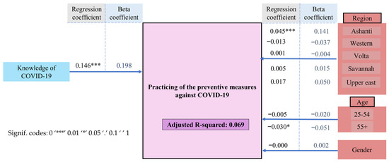 The practices against COVID-19 model employed to assess the influences of knowledge related to COVID-19 and the practicing of preventive measures recommended by the WHO. The results are shown in terms of regression coefficient estimates and beta coefficients.