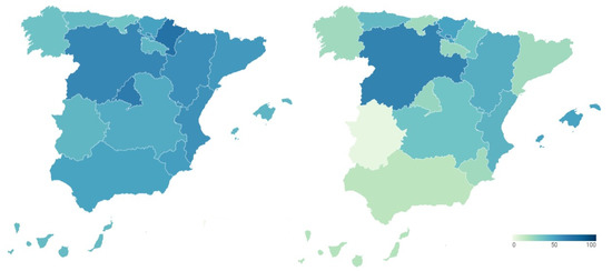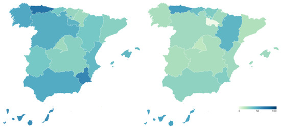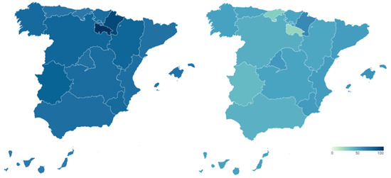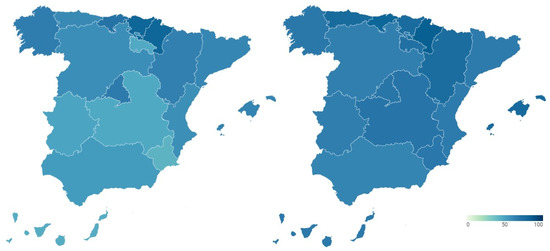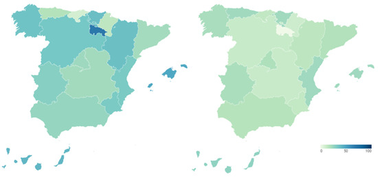 Secondly, we incorporate the health reputation resulting from the perception of Spanish citizens, who are the users and potential users of the health system. Figure 6 shows these data broken down again by Autonomous Community, showing the percentage of citizens who say that the functioning of the health system is very or fairly satisfactory in each of them before (map on the left) and during (map on the right) COVID-19. Detailed data can be consulted in Table A5 of Appendix A.
