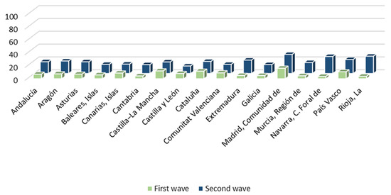 As a consequence, both the direct experience of citizens with the health system and their exposure to the media during the pandemic are examined. Thus, Figure 2 shows the percentage of citizens who have visited the health services for symptoms related to the coronavirus during the first and second waves of the pandemic. These data are broken down by Autonomous Community. The proportion of citizens who have had a direct experience with health services does not exceed 30% in any of the pandemic waves considered. During the first wave of COVID-19, the citizens of the Community of Madrid (16.4%), Castilla-La Mancha (12.2%), Catalonia (11.8%) and the Basque Country (10.8%) were those who had to resort to the health system to the greatest extent, although they represent a very small percentage of the population. During the second wave, the Community of Madrid (29.6%), La Rioja (26.9%), Navarra (26.4%), the Basque Country (21.7%) and Extremadura (20.8%) were the regions that recorded the greatest contact of their citizens with health services, also representing limited proportions of the population. Consequently, the majority of citizens had no direct contact with the health system during the first two waves of the pandemic.