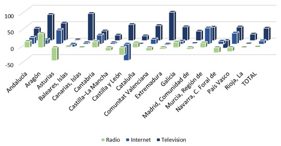Taking into account regional differences, it is necessary to point out that the Autonomous Communities in which television consumption grew the most were Extremadura (86.4 min), the Canary Islands (82.2 min) and Aragon (79.2 min). The regions that most increased their exposure to the Internet were the Region of Murcia (49.2 min), Asturias (43.2 min) and the Basque Country (33.6 min). Finally, radio consumption increased especially in Aragon (42.6 min), Andalusia (18.6 min) and Cantabria (18.0 min).