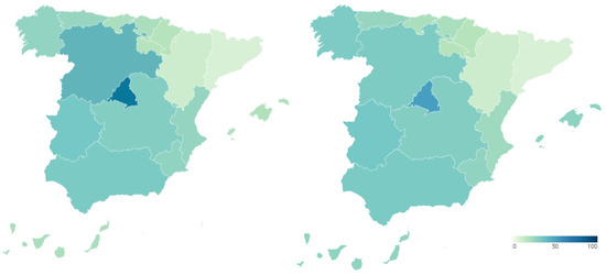 The reputation of the Spanish health system is measured from two perspectives. Firstly, the reputation of the health system is presented as a result of the perception of healthcare professionals and experts in the field. Figure 5 shows the percentage of hospitals in the top 100 of the Merco MRS out of the total number of hospitals that make up the healthcare system of each Autonomous Community before (map on the left) and during (map on the right) the pandemic. Detailed data can be consulted in Table A3 and Table A4 of Appendix A.