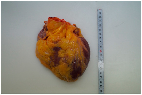 No blood fluid in the abdominal or thoracic cavity, while the serous surfaces of the ileum appeared to be widely congested with blood collections in the perivisceral fat and enlarged lymph nodes. Macroscopically, the heart and other systemic organs appeared normal in diameter and features. The heart was 397 g in weight (Figure 1). After four-chamber opening, no relevant defects were observed at the examination of the valvular apparatuses, emerging vessels and cardiac cavities. The ventricular walls had normal thickness, as well as the interventricular septum. No abnormal origins of the coronary arteries were observed, along with no atherosclerotic lesions.