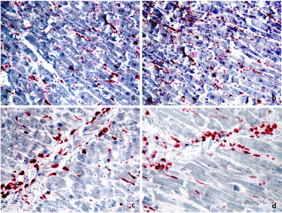 Histology and immunohistochemistry. For each organ, sampling was carried out. After fixation in 10% neutral buffered formalin and paraffin embedding, extensive sampling of the ventricles and atria was performed. The tissues along the course of the coronary arteries with the anterior and posterior descending branches and of the septum including the conduction system were also sampled. Sections for haematoxylin–eosin staining (H&E) for morphological diagnosis and serial sections of 4 microns for immunohistochemistry (IH) were performed. Human monoclonal anti-CD68 and anti-lysozyme antibodies (1:100) with the DAB Substrate-Chromogen system and Alkaline Phosphatase/RED (DAKO) were used.