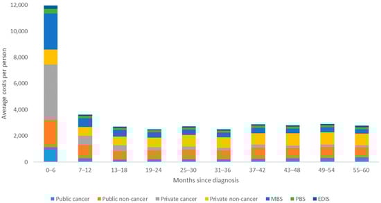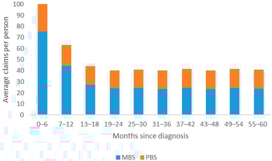 The total MBS and PBS costs within this study were $35.4 million and $9.9 million, respectively. There was a total of 1,697,459 MBS items claimed by breast cancer patients over five years, an average of 315 (SD = 187) claims per person. There was a total of 972,649 PBS pharmaceuticals claimed by breast cancer patients over five years, an average of 181 (SD = 145) claims per person. The highest average and total cost and number of items accessed for both MBS and PBS were highest during the first six months post-diagnosis (see Figure 1 and Figure 3). For the remaining time, MBS and PBS items claimed and average costs remained relatively similar. On average, individuals within this sample paid $1836 (SD = $1489) out of their own pocket for pharmaceuticals and $6578 (SD = $7248) on healthcare partially covered by Medicare over the course of five years (Table 2).