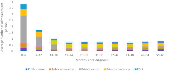 Across both public and private hospital admissions, total and average costs and admissions were greatest in the first six-months following diagnosis (see Figure 1 and Figure 2). Within this time frame, cancer-related admissions accounted for only 35% of total costs to public health funders, compared to 79% for cancer-related admissions in private hospitals. After this initial six-month period, the proportion of total costs for cancer-related private hospital admissions becomes lower than the proportion relating to non-cancer related private hospital admissions for the remaining five-year period. Within public hospital admissions, the cost and number of cancer-related admissions remains relatively low in comparison to non-cancer related admissions across the entire five-year period (see Figure 1 and Figure 2).