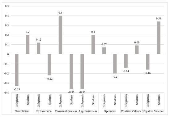 Figure 1. Differences between lifeguards and students on the dimensions of the BF+2 questionnaire (Z—scores).