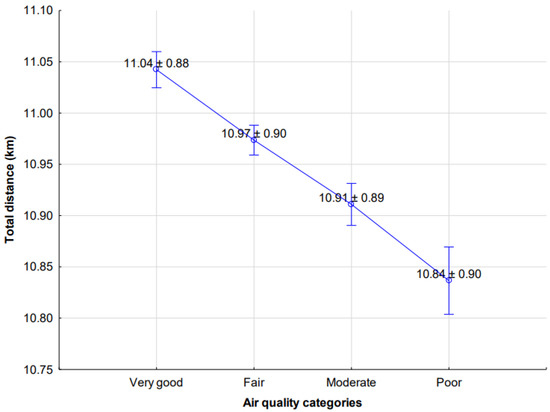 Differences in total distance covered by soccer players in relation to changes in air quality categories (mean ± SE). Differences statistically significant between very good vs. fair p = 0.01, fair vs. moderate p = 0.01, and moderate vs. poor p = 0.05 (Source: own elaboration).