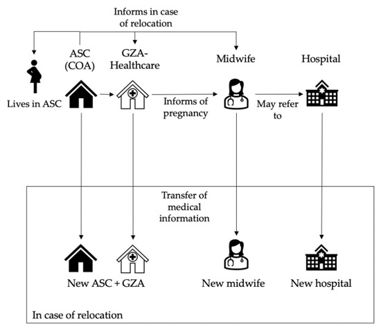 In The Netherlands, healthcare is covered by governmental insurance for asylum seekers. Asylum seekers receive primary healthcare from a contracted organization (GZA Healthcare) which has health centers in most ASCs, while perinatal care is provided by midwifery practices located near ASCs. In the Dutch system, all pregnant women, including asylum seekers, receive midwife-led care unless they are referred to gynecologists/obstetricians in case of (threatening) complications or “high-risk” pregnancy. In case of the relocation of asylum seekers during pregnancy, all medical care and patient history is transferred to new care providers at the next GZA, midwifery practice and/or hospital (see Figure 1). The specific pathways and responsibilities in birth care for asylum seekers have been documented in a national guideline for all stakeholders involved [20].