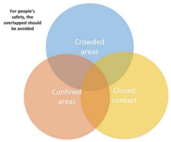 The proposed model aims to predict and track any COVID-19 patient to avoid or control infection spread. For safety considerations, people should avoid the intersection between crowded areas, confined spaces, and close contact with other people as shown in Figure 1. Inevitably, many people may not be able to avoid all these conditions at the same time and possibly get infected if they are not following the required precautions. The proposed model is designed to be deployed in any closed area such as malls, hotels, schools, hospitals and companies, where RFID is used to detect and track any COVID cases.