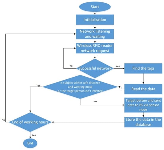For efficient and accurate tracking, it is assumed that people are wearing an RFID tag when entering any closed area, which will be connected to an RFID reader. The role of an RFID reader is to collect data required for COVID-19 detection continuously such as temperature, blood oxygen, and sensing the distance between any two people as shown in Figure 2.