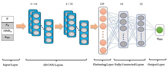 The proposed model starts with the four normalized variables that are to be collected, at the time an RFID reader intends to send information to the BS thus needs to calculate the optimal distance to send it efficiently and reliably. The input data represent the required QoS (), transmission power (), a threshold signal-to-interference-plus-noise ratio (SINRth) and distance between interfering transmitting devices and the base station ). The data from the input layer are propagated through two hidden 1D CNNs. The first 1D-CNN has 64 filters, a kernel of size 4, and the output is padded thus reserving the matrix dimension to be input to the following 1D-CNN of 32 filters.