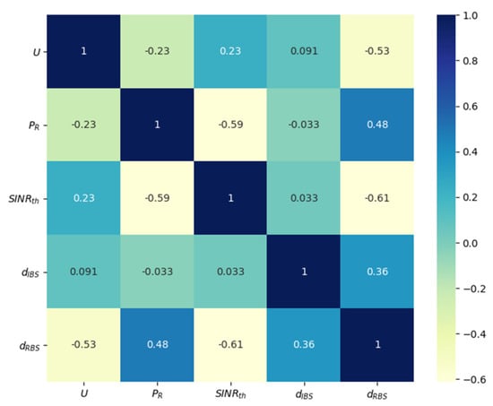 IoT systems are based on the presence of a vast number of sensors collecting information all the time. The collected information needs to be efficiently transmitted from each RFID reader to a base station for further processing. In real life, the transmission of such data can be affected by environmental factors, such as signal-to-noise ratio, or sensor-related parameters such as the power of transmission. Therefore, determination of the optimal distance according to which an RFID can send the data reliably to the base station is needed. Since the factors affecting transmission could change, the presence of a machine learning-based system helps to build an initial model that could then be updated whenever needed [34,35]. According to the analytical equations presented in Section 2.3, in the proposed system the variables , , SINRth and could affect the optimal distance of reliable data transmission between the RFID reader and the base station.